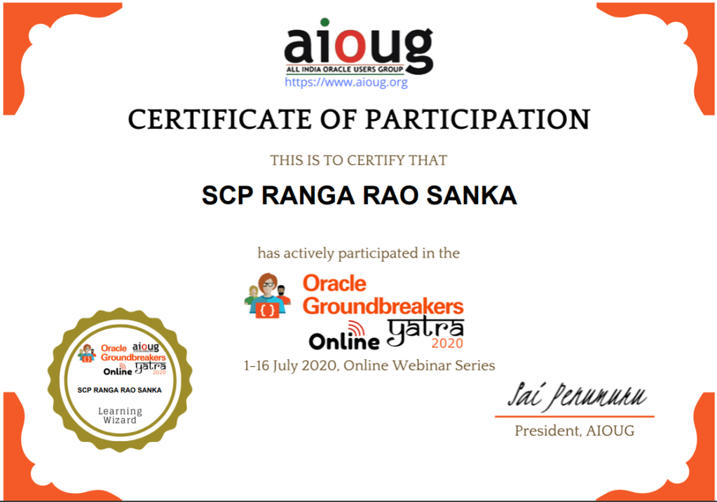 Hi there, This is SCP Ranga Rao Sanka working as (A product Manager/Principal DBA)., I have a broad range of Experience in Administration and Implementation in the areas of Database, Cloud, and Other Servers. I am one of the moderators at ORAFAQ. The primary purpose of this blog is to share knowledge.