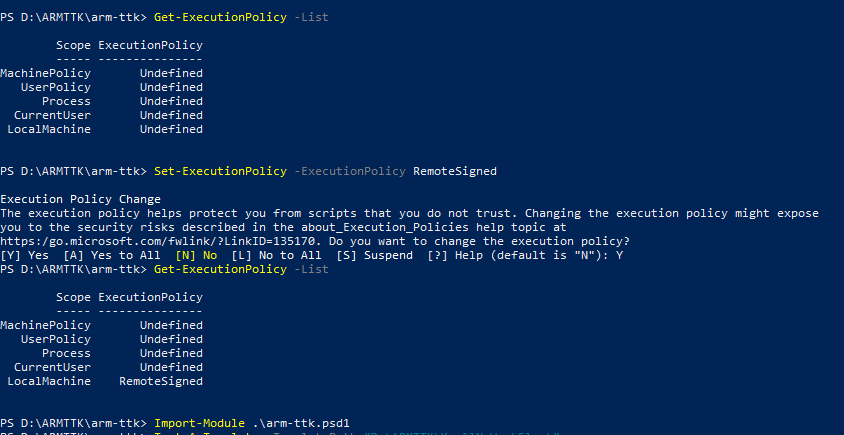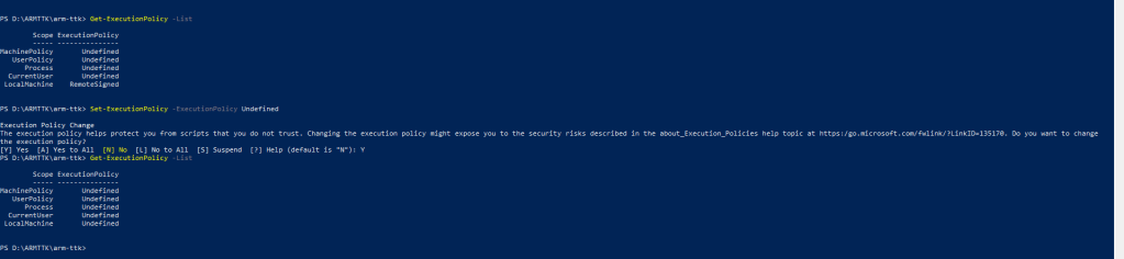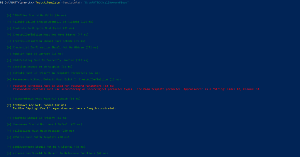 PS D:\ARMTTK\arm-ttk> Test-AzTemplate -TemplatePath "D:\ARMTTK\XcellNoWorkFlow\" Validating XcellNoWorkFlow\createUiDefinition.json JSONFiles Should Be Valid [+] JSONFiles Should Be Valid (30 ms) Allowed Values Should Actually Be Allowed [+] Allowed Values Should Actually Be Allowed (100 ms) Controls In Outputs Must Exist [+] Controls In Outputs Must Exist (19 ms) CreateUIDefinition Must Not Have Blanks [+] CreateUIDefinition Must Not Have Blanks (21 ms) CreateUIDefinition Should Have Schema [+] CreateUIDefinition Should Have Schema (13 ms) Credential Confirmation Should Not Be Hidden [+] Credential Confirmation Should Not Be Hidden (93 ms) Handler Must Be Correct [+] Handler Must Be Correct (10 ms) HideExisting Must Be Correctly Handled [+] HideExisting Must Be Correctly Handled (154 ms) Location Should Be In Outputs [+] Location Should Be In Outputs (9 ms) Outputs Must Be Present In Template Parameters [+] Outputs Must Be Present In Template Parameters (10 ms) Parameters Without Default Must Exist In CreateUIDefinition [+] Parameters Without Default Must Exist In CreateUIDefinition (20 ms) Password Textboxes Must Be Used For Password Parameters [+] Password Textboxes Must Be Used For Password Parameters (65 ms) PasswordBoxes Must Have Min Length [+] PasswordBoxes Must Have Min Length (60 ms) Textboxes Are Well Formed [?] Textboxes Are Well Formed (66 ms) TextBox 'AppLoginEmail' regex does not have a length constraint. Tooltips Should Be Present [+] Tooltips Should Be Present (66 ms) Usernames Should Not Have A Default [+] Usernames Should Not Have A Default (61 ms) Validations Must Have Message [+] Validations Must Have Message (60 ms) VMSizes Must Match Template [+] VMSizes Must Match Template (62 ms) Validating XcellNoWorkFlow\mainTemplate.json adminUsername Should Not Be A Literal [+] adminUsername Should Not Be A Literal (59 ms) apiVersions Should Be Recent In Reference Functions [+] apiVersions Should Be Recent In Reference Functions (11 ms) apiVersions Should Be Recent [+] apiVersions Should Be Recent (117 ms)
