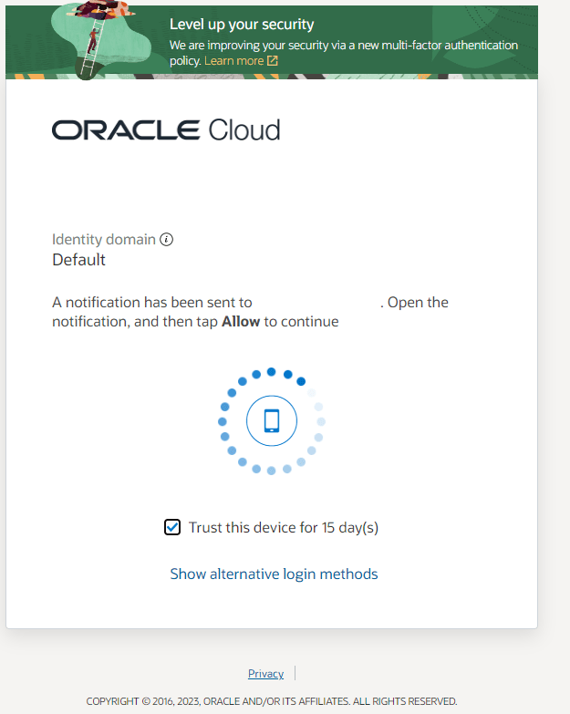 When signing up, it is mandatory to configure and enable Multi-Factor Authentication (MFA). Once configured, during the login process, you will be required to obtain approval either through the Oracle Authenticator App or by obtaining a passcode.