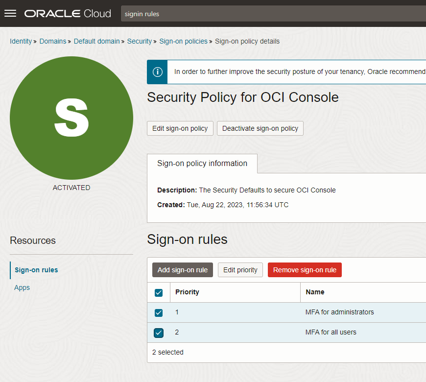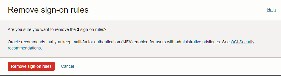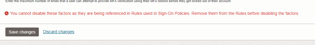 You can change the Default Configuration under Identity–>Domains–>Default domain–>Security –>MFA, when you try to update the changes , you may get the error as below “You cannot disable these factors as they are being referenced in Rules used in Sign-On Policies. Remove them from the Rules before disabling the factors.”