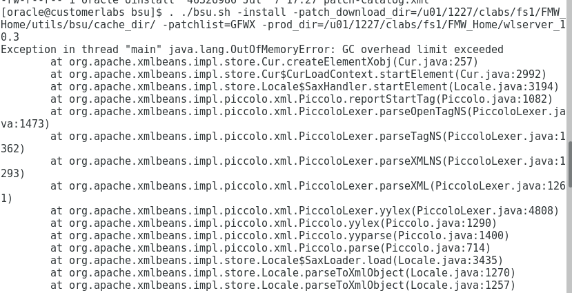 For more Details Ref Oracle MOS Doc: Weblogic 10.3.6 Patching Error Using BSU – “java.lang.OutOfMemoryError: GC overhead limit exceeded” (Doc ID 2007492.1) and